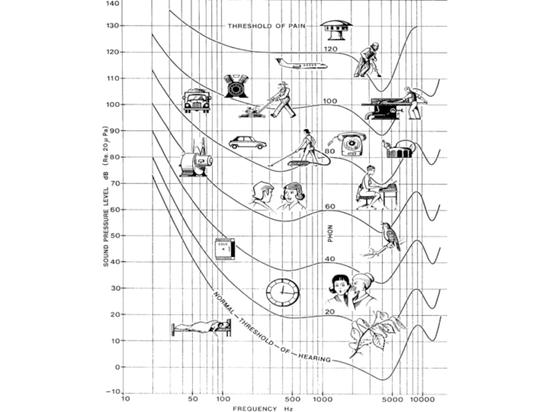 на пороге слышимости равен 0дБ при звуковом давлении 2*10-5 Па, а на пороге болевого ощущения 140дБ при звуковом давлении 2*102 Па. Область, расположенная между порогами, называется зоной слышимости звука.