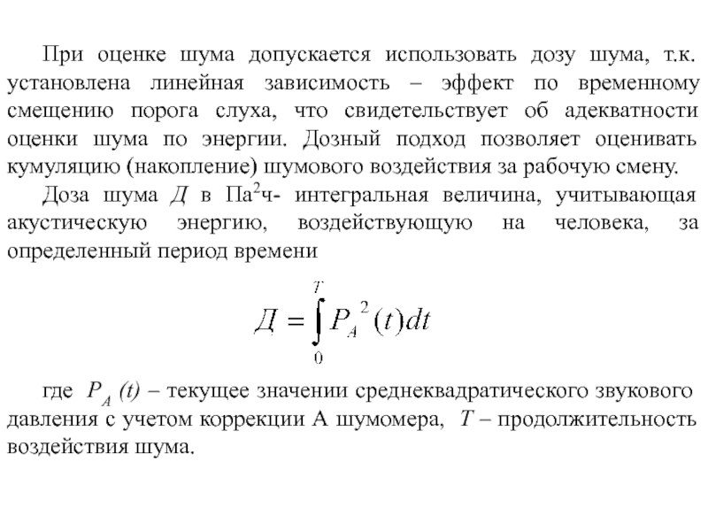 Доза шума Д в Па2ч- интегральная величина, учитывающая акустическую энергию, воздействующую на человека, за определенный период времени