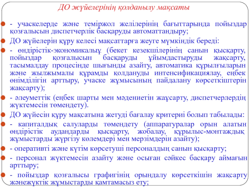 ДО жүйелерінің қолданылу мақсаты- учаскелерде және теміржол желілерінің бағыттарында пойыздар қозғалысын диспетчерлік басқаруды автоматтандыру;ДО жүйелерін құру келесі