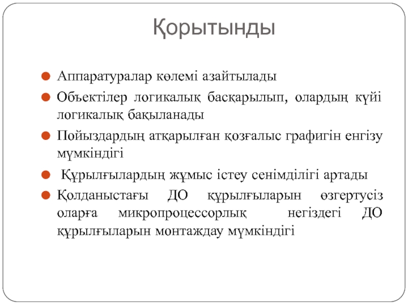 ҚорытындыАппаратуралар көлемі азайтыладыОбъектілер логикалық басқарылып, олардың күйі логикалық бақыланадыПойыздардың атқарылған қозғалыс графигін енгізу мүмкіндігі Құрылғылардың жұмыс істеу