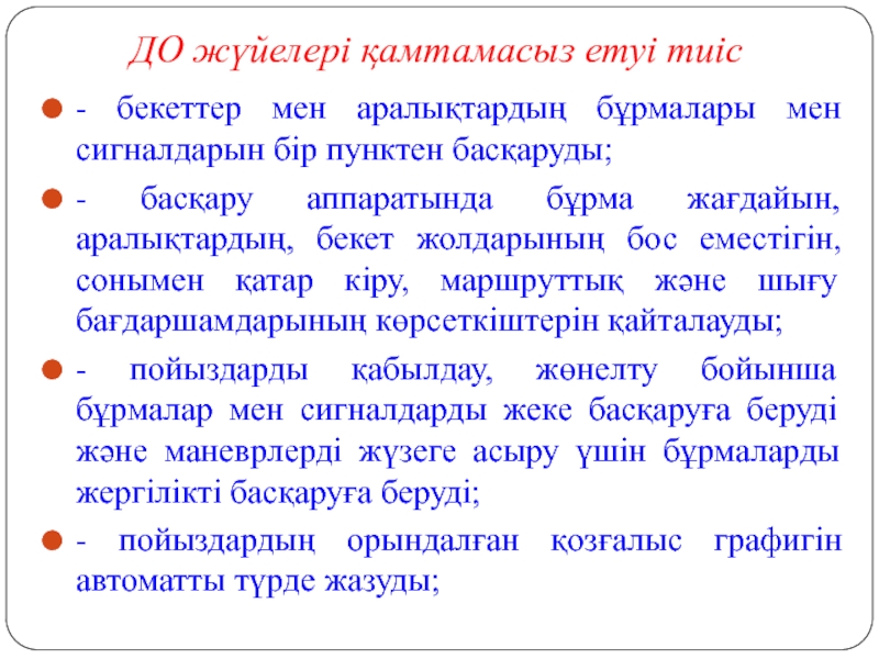 ДО жүйелері қамтамасыз етуі тиіс- бекеттер мен аралықтардың бұрмалары мен сигналдарын бір пунктен басқаруды;- басқару аппаратында бұрма