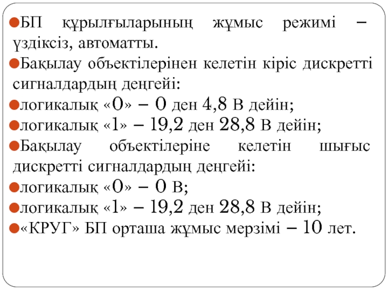 БП құрылғыларының жұмыс режимі – үздіксіз, автоматты.Бақылау объектілерінен келетін кіріс дискретті сигналдардың деңгейі:логикалық «0» – 0 ден
