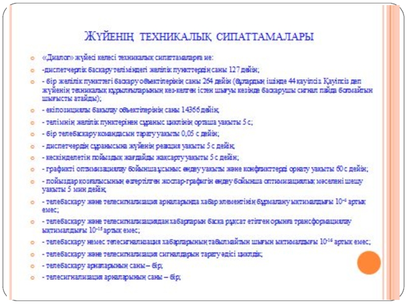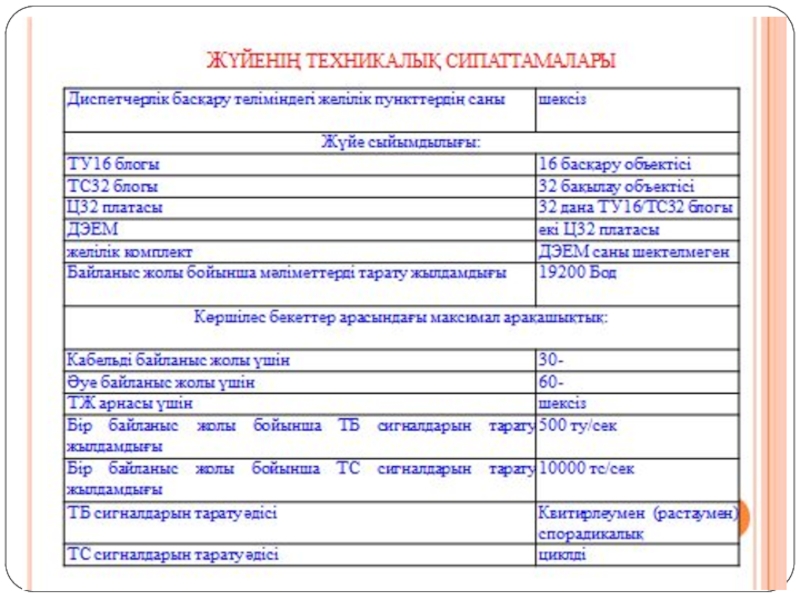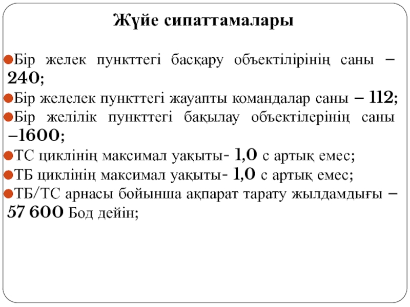 Жүйе сипаттамаларыБір желек пункттегі басқару объектілірінің саны – 240;Бір желелек пункттегі жауапты командалар саны – 112;Бір желілік