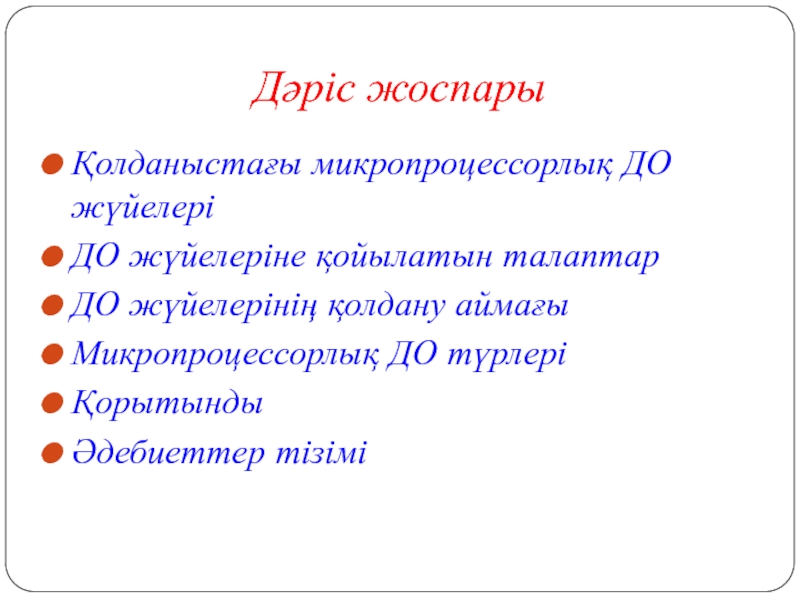Дәріс жоспарыҚолданыстағы микропроцессорлық ДО жүйелеріДО жүйелеріне қойылатын талаптарДО жүйелерінің қолдану аймағыМикропроцессорлық ДО түрлеріҚорытындыӘдебиеттер тізімі
