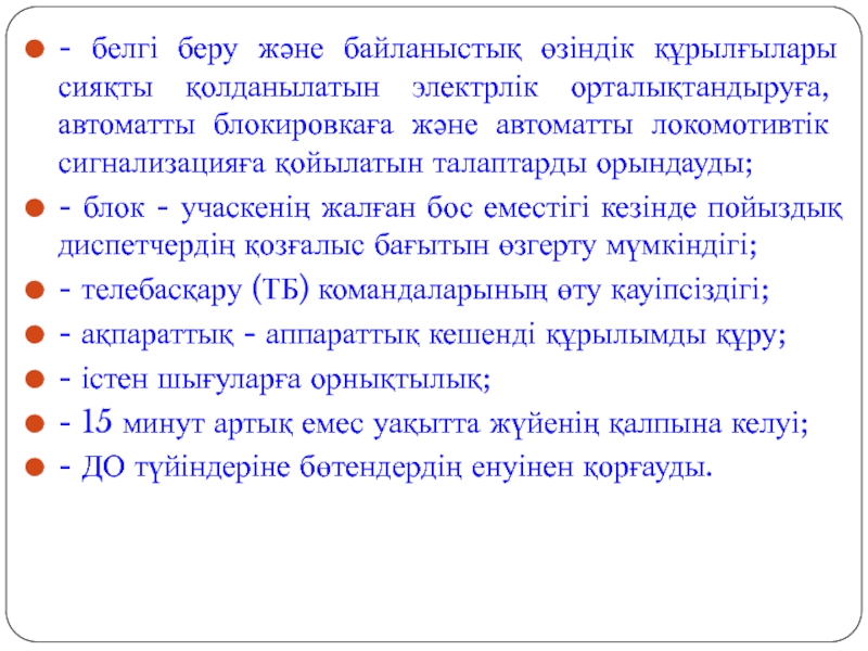 орталықтандыруға, автоматты блокировкаға және автоматты локомотивтік сигнализацияға қойылатын талаптарды орындауды;
