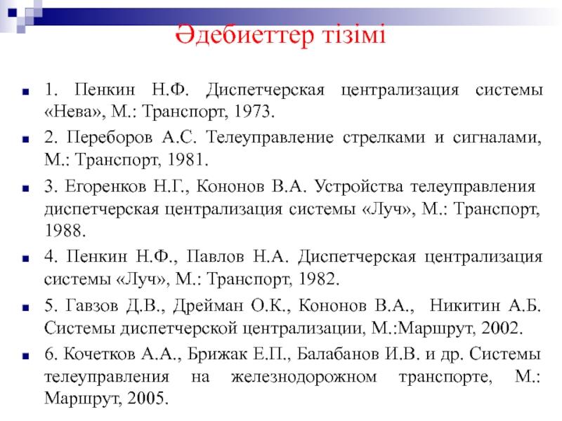 Әдебиеттер тізімі 1. Пенкин Н.Ф. Диспетчерская централизация системы «Нева», М.: Транспорт, 1973.2. Переборов А.С. Телеуправление стрелками и