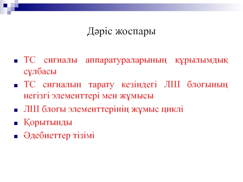 Дәріс жоспарыТС сигналы аппаратураларының құрылымдық сұлбасыТС сигналын тарату кезіндегі ЛШ блогының негізгі элементтері мен жұмысыЛШ блогы элементтерінің жұмыс цикліҚорытындыӘдебиеттер тізімі
