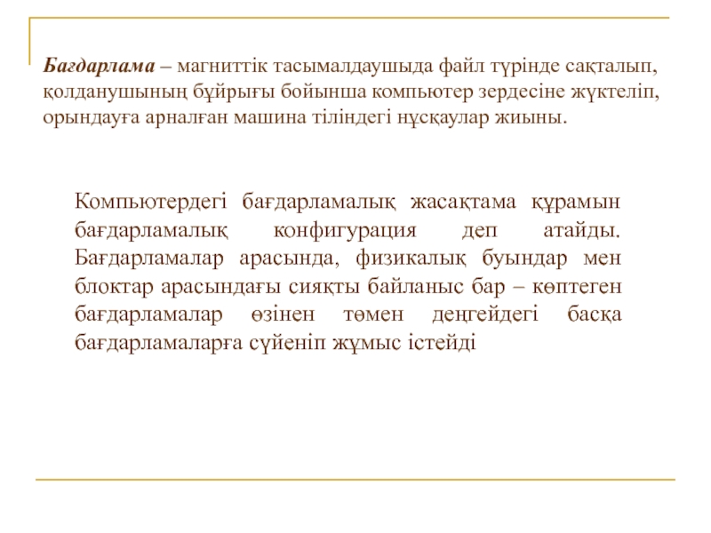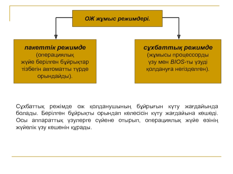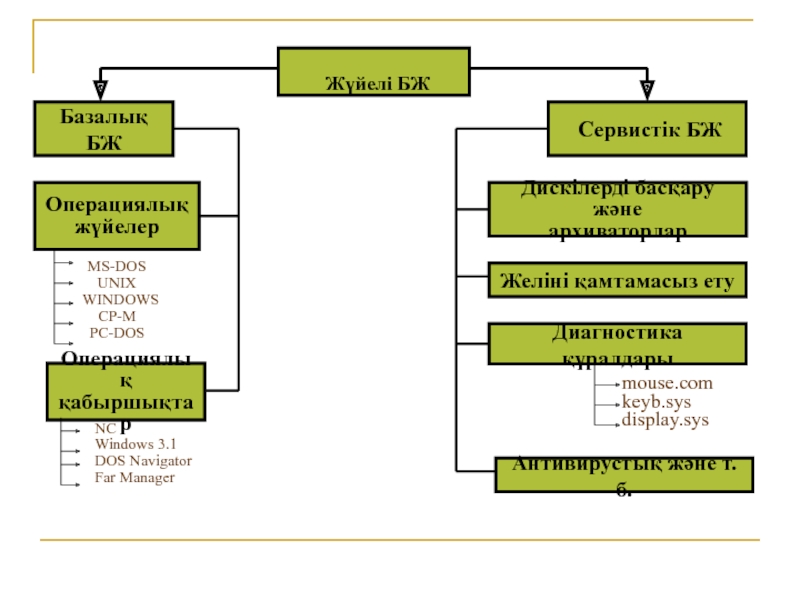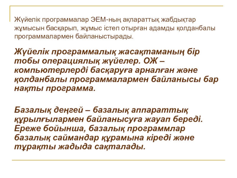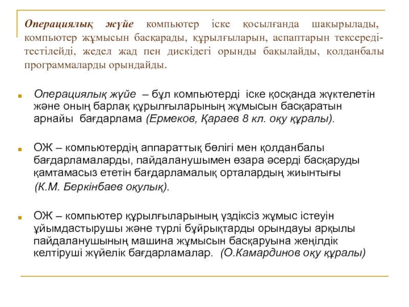 ОЖ – компьютер құрылғыларының үздіксіз жұмыс істеуін ұйымдастырушы және түрлі бұйрықтарды орындауы арқылы пайдаланушының машина жұмысын басқаруына жеңілдік келтіруші жүйелік бағдарламалар. (О.Камардинов оқу құралы)