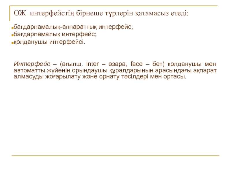ОЖ – компьютердің аппараттық бөлігі мен қолданбалы бағдарламаларды, пайдаланушымен өзара әсерді басқаруды қамтамасыз ететін бағдарламалық орталардың жиынтығы