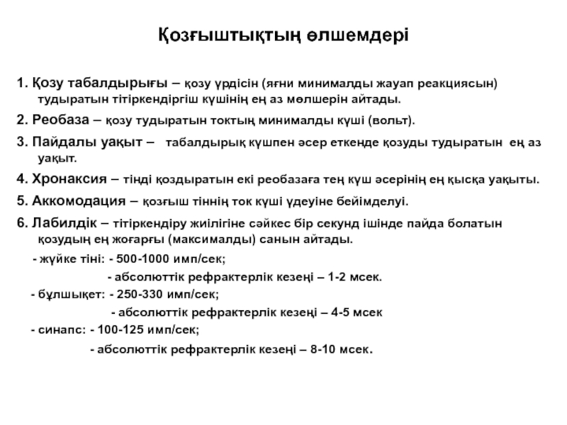 өлшемдері (реобаза, әсердің пайдалы уақыт, хронаксия, аккомодация, лабилдік). 2. Жүйке талшықтарының құрылымдық және физиологиялық ерекшеліктері.