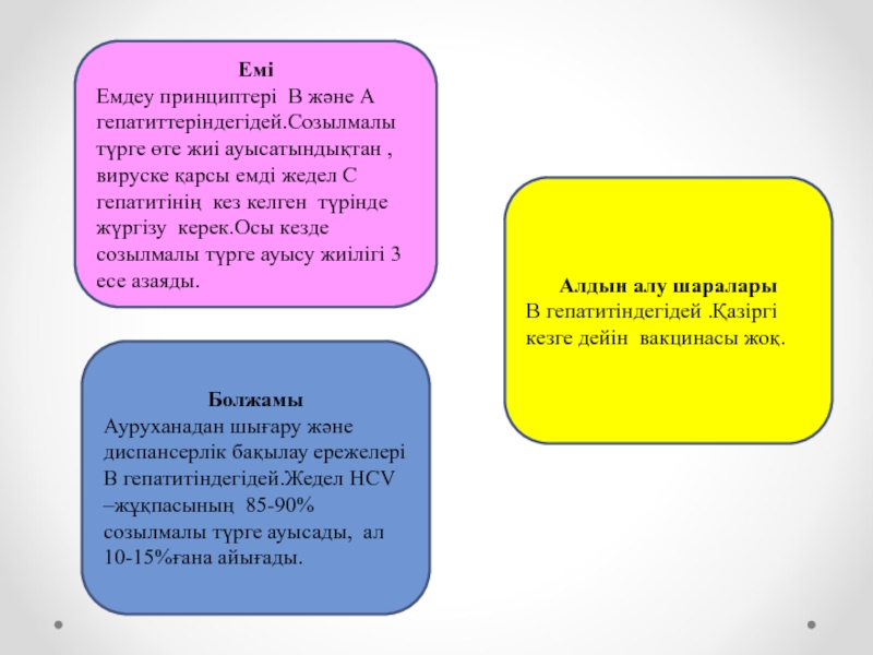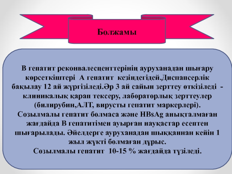 Ауруханадан шығару және диспансерлік бақылау ережелері В гепатитіндегідей.Жедел HCV –жұқпасының 85-90% созылмалы түрге ауысады, ал 10-15%ғана айығады.