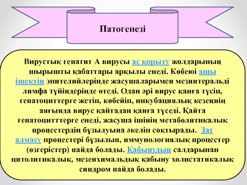 түсіп, гепатоциттерге жетіп, көбейіп, инкубациялық кезеңнің аяғында вирус қайтадан қанға түседі. Қайта гепатоцитттерге енеді, жасуша ішінің метаболитикалық процестердің бұзылуына әкеліп соқтырады. Зат алмасу процестері бұзылып, иммунологиялық процестер (өзгерістер) пайда болады. Қабынудың салдарынан цитолитикалық, мезенхимальдық қабыну холистатикалық синдром пайда болады.