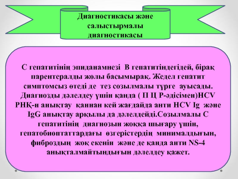 түрге ауысады. Диагнозды дәлелдеу үшін қанда ( П Ц Р-әдісімен)HCV РНҚ-н анықтау қаннан кей жағдайда анти HCV Ig және IgG анықтау арқылы да дәлелдейді.Созылмалы С гепатитінің диагнозын жоққа шығару үшін, гепатобиоптаттардағы өзгерістердің минималдығын, фиброздың жоқ екенін және де қанда анти NS-4 анықталмайтындығын дәлелдеу қажет.
