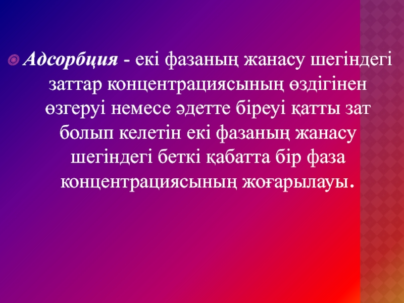 Слайд 3Адсорбция - екі фазаның жанасу шегіндегі заттар концентрациясының өздігінен өзгеруі