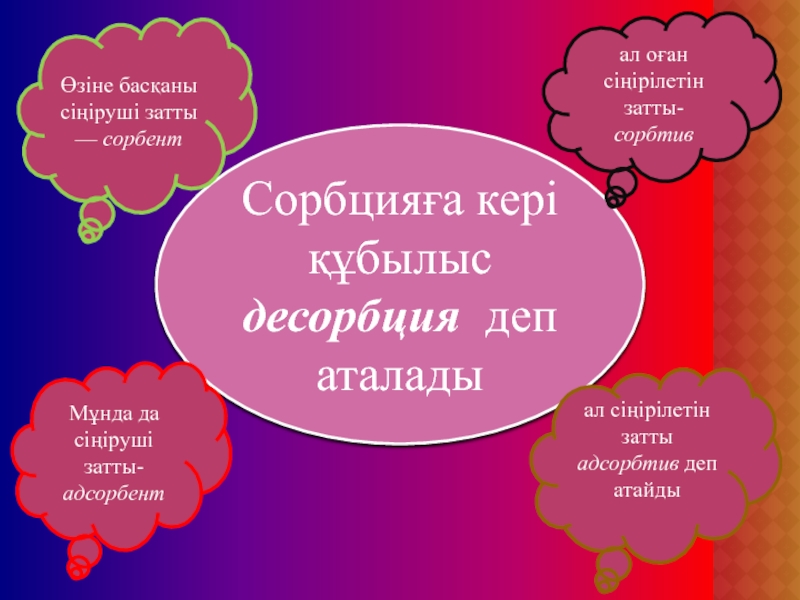 Сорбцияға кері құбылыс десорбция деп аталадыӨзіне басқаны сіңіруші затты — сорбентМұнда да сіңіруші затты- адсорбентал оған сіңірілетін