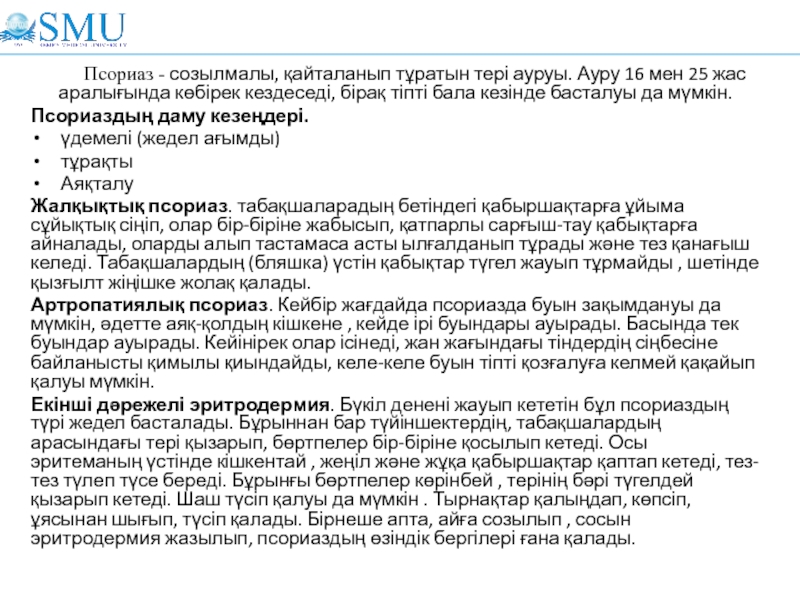 Слайд 26Псориаз - созылмалы, қайталанып тұратын тері ауруы. Ауру 16 мен