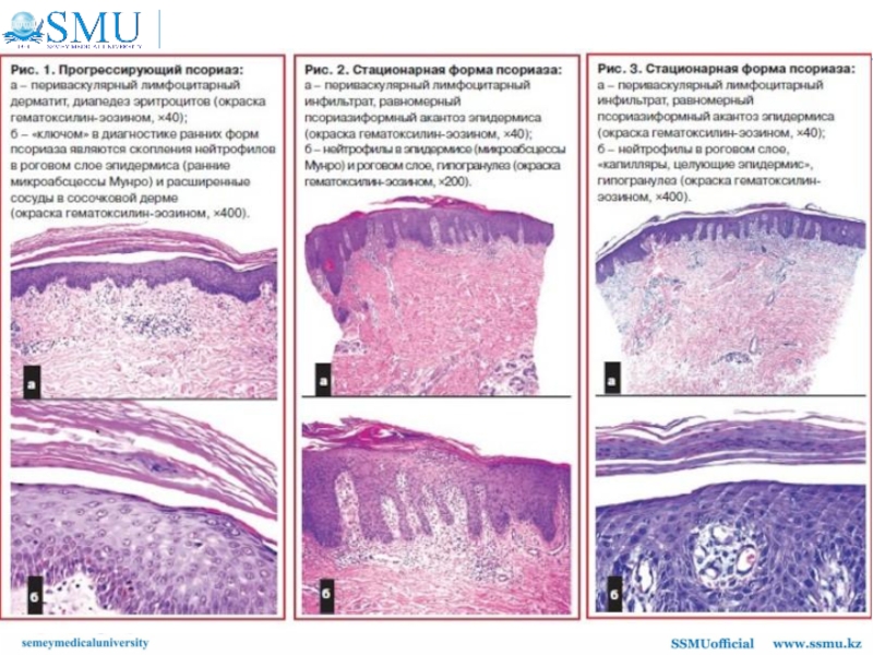 Гистология: эпидермисте акантоз, паракератоз, гиперкератоз, әлсін спонгиоз байқалады. Дермада —