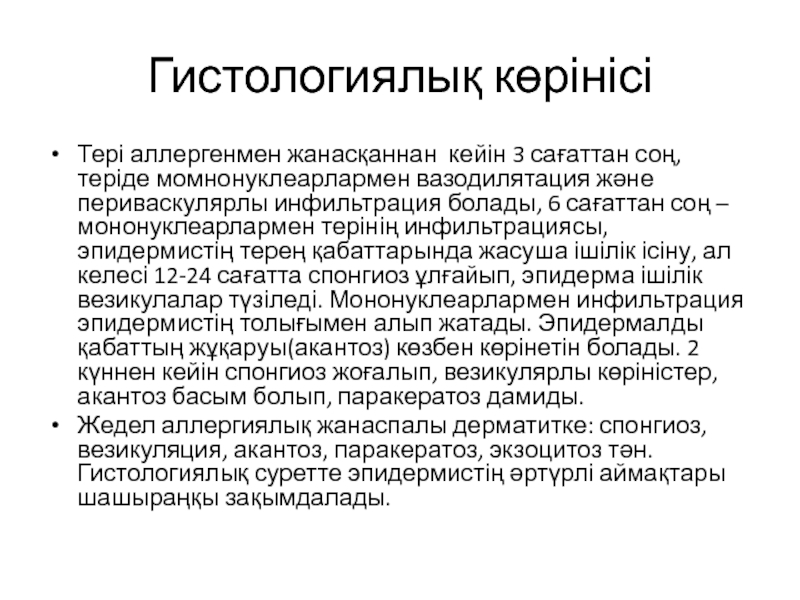 Жедел аллергиялық жанаспалы дерматитке: спонгиоз, везикуляция, акантоз, паракератоз, экзоцитоз тән. Гистологиялық суретте эпидермистің әртүрлі аймақтары шашыраңқы зақымдалады.