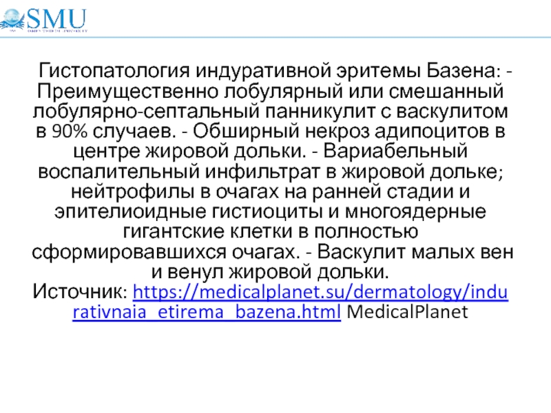 адипоцитов в центре жировой дольки. - Вариабельный воспалительный инфильтрат в жировой дольке; нейтрофилы в очагах на ранней стадии и эпителиоидные гистиоциты и многоядерные гигантские клетки в полностью сформировавшихся очагах. - Васкулит малых вен и венул жировой дольки.Источник: https://medicalplanet.su/dermatology/indurativnaia_etirema_bazena.html MedicalPlanet