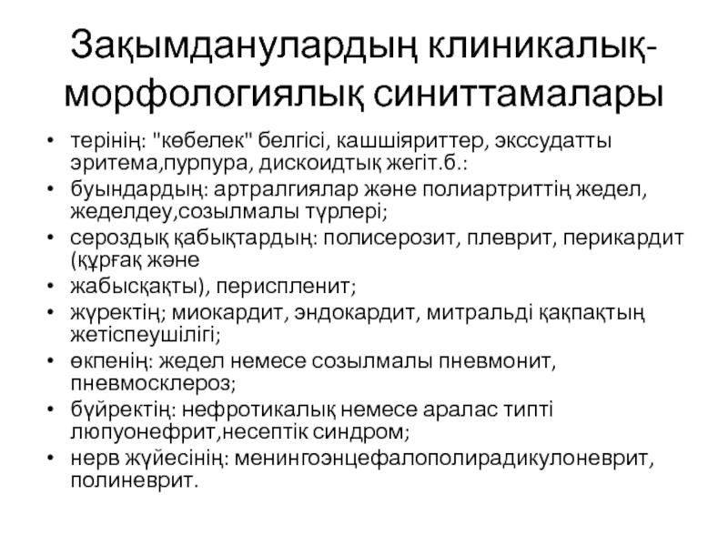 Слайд 43Зақымданулардың клиникалық-морфологиялық синиттамалары