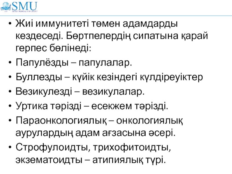 Слайд 62Жиі иммунитеті төмен адамдарды кездеседі. Бөртпелердің сипатына қарай герпес бөлінеді: