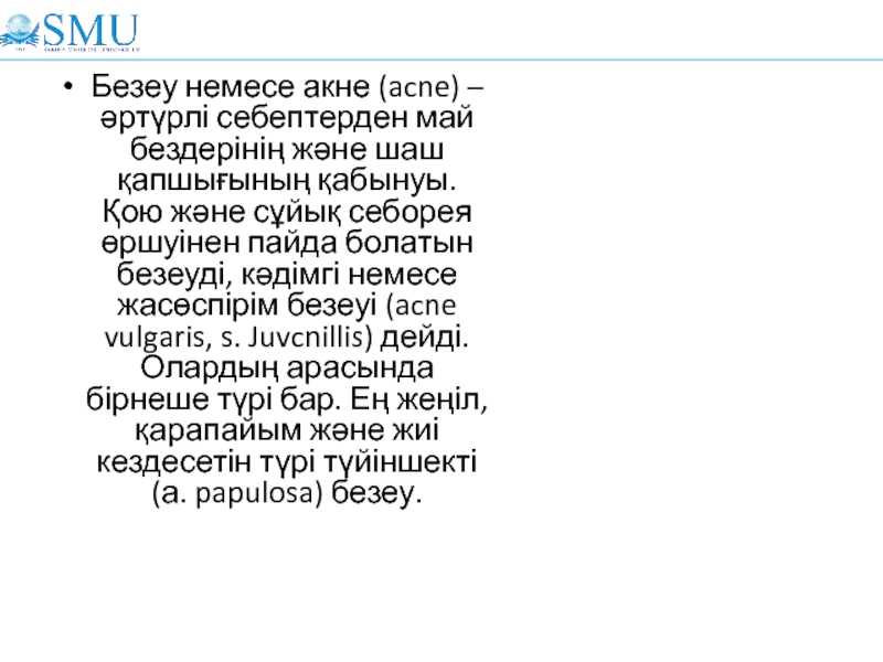 Слайд 47Безеу немесе акне (acne) – әртүрлі себептерден май бездерінің және