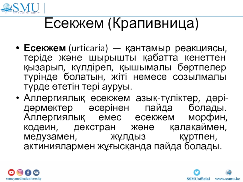 Тері аурулары: Есекжем, Аллергиялық контактты дерматит, атопиялық дерматит. Мультиформалы