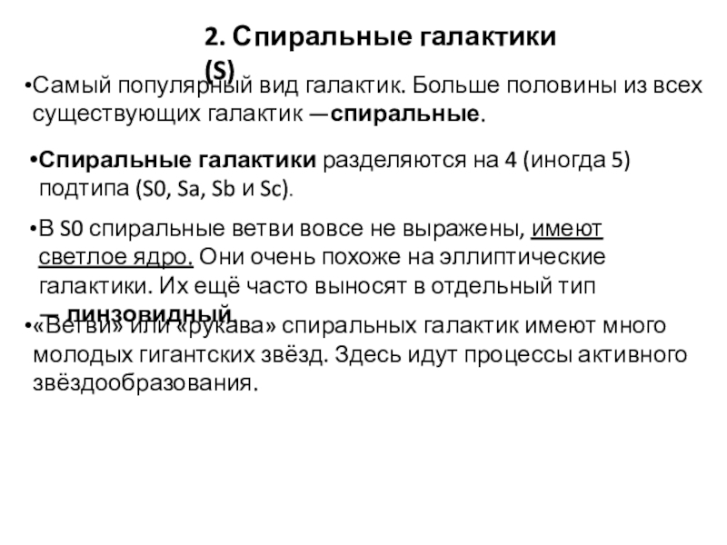 В S0 спиральные ветви вовсе не выражены, имеют светлое ядро. Они очень похоже на эллиптические галактики. Их ещё часто выносят в отдельный тип — линзовидный.