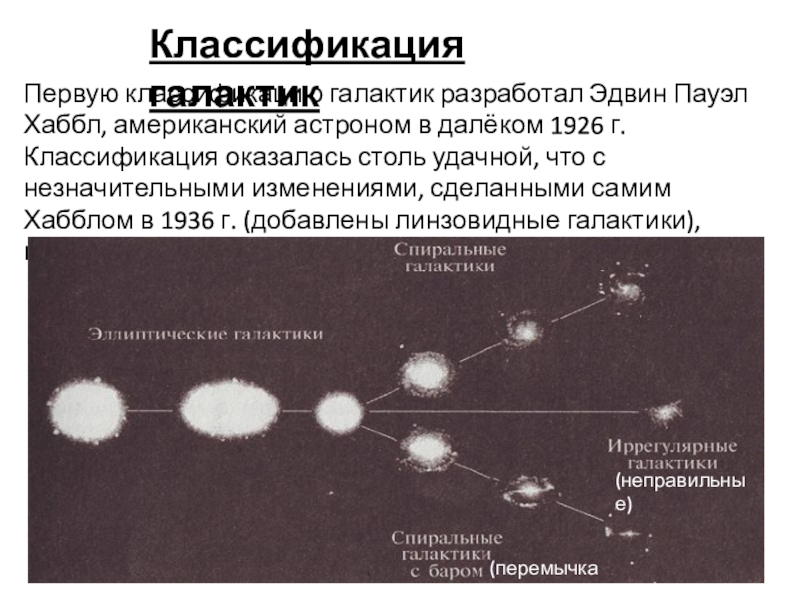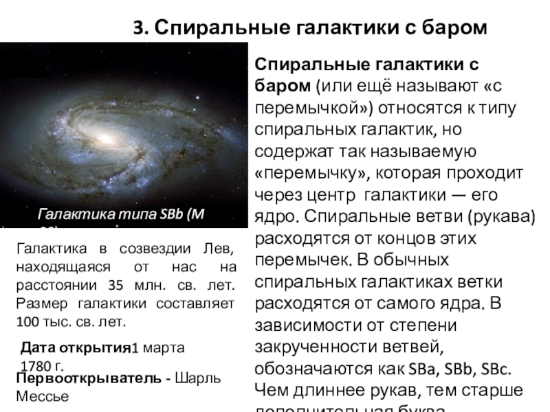 Спиральные галактики с баром (или ещё называют «с перемычкой») относятся к типу спиральных галактик, но содержат так называемую «перемычку», которая проходит через центр галактики — его ядро. Спиральные ветви (рукава) расходятся от концов этих перемычек. В обычных спиральных галактиках ветки расходятся от самого ядра. В зависимости от степени закрученности ветвей, обозначаются как SBa, SBb, SBc. Чем длиннее рукав, тем старше дополнительная буква.