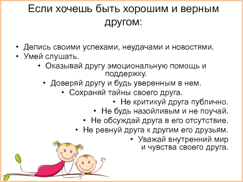 Если хочешь быть хорошим и верным другом: Делись своими успехами, неудачами и новостями.Умей слушать.Оказывай другу эмоциональную помощь