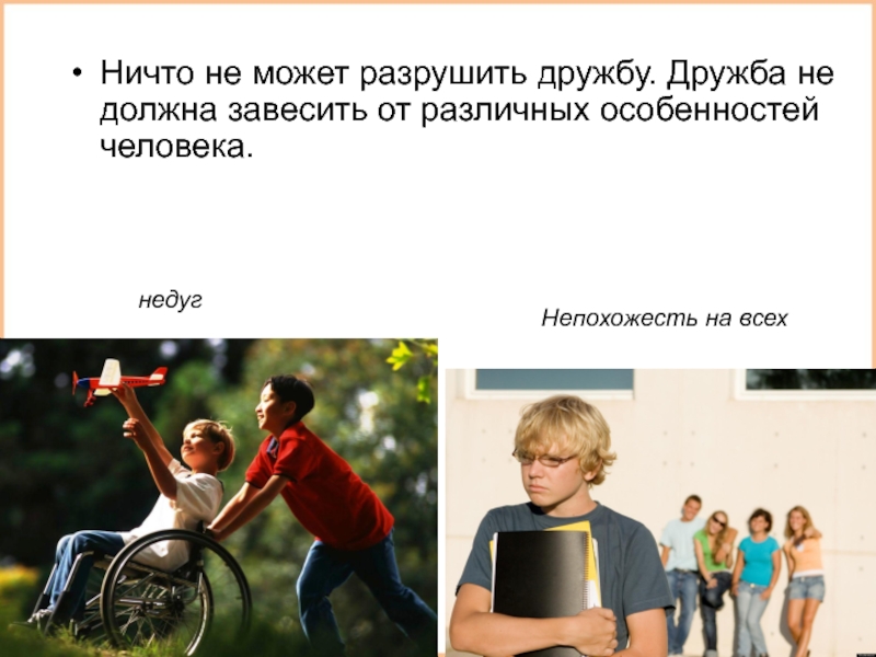 Ничто не может разрушить дружбу. Дружба не должна завесить от различных особенностей человека.недугНепохожесть на всех