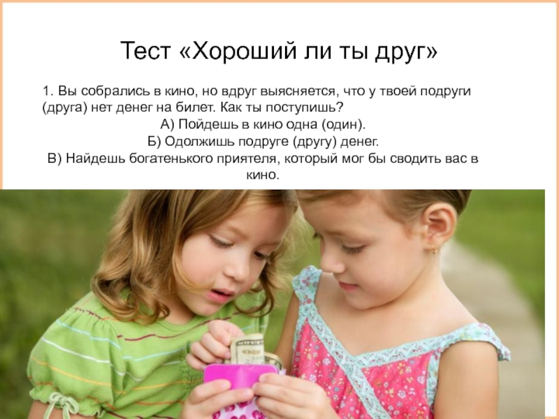 Тест «Хороший ли ты друг» 1. Вы собрались в кино, но вдруг выясняется, что у твоей подруги