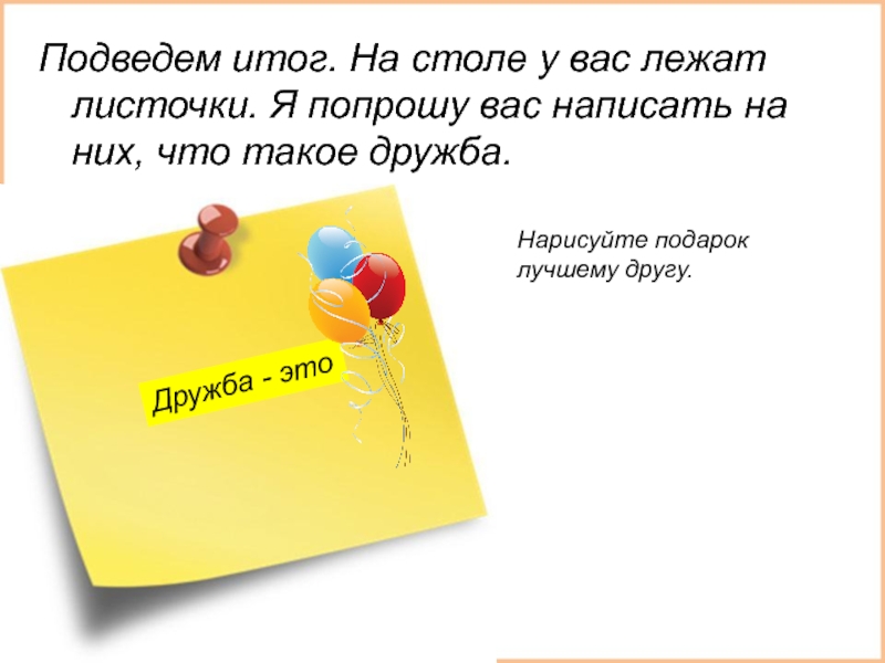 Подведем итог. На столе у вас лежат листочки. Я попрошу вас написать на них, что такое дружба.Дружба