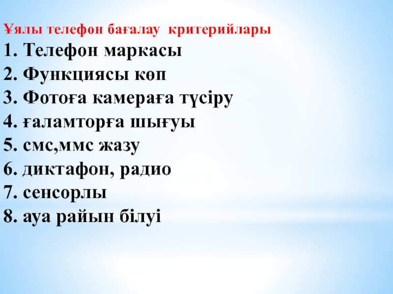 1. Телефон маркасы 2. Функциясы көп 3. Фотоға камераға түсіру 4. ғаламторға шығуы 5. смс,ммс жазу 6. диктафон, радио 7. сенсорлы 8. ауа райын білуі