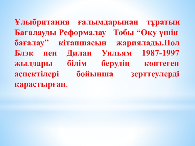 Слайд 4Ұлыбритания ғалымдарынан тұратын Бағалауды Реформалау Тобы “Оқу үшін бағалау”