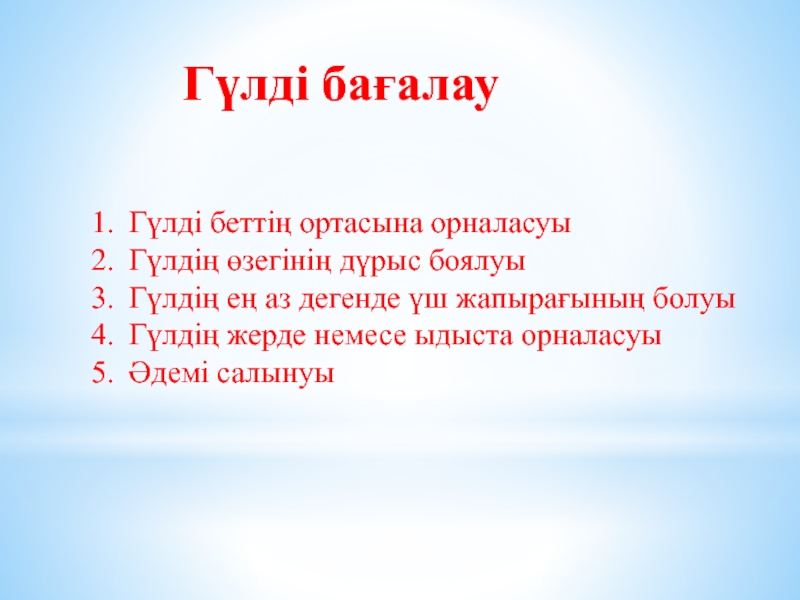 Гүлді бағалау Гүлді беттің ортасына орналасуыГүлдің өзегінің дүрыс боялуыГүлдің ең аз дегенде