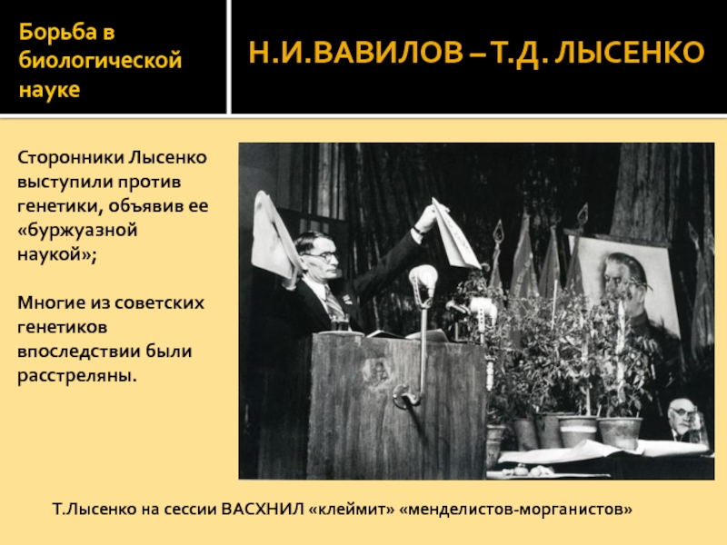 Т.Лысенко на сессии ВАСХНИЛ «клеймит» «менделистов-морганистов»
