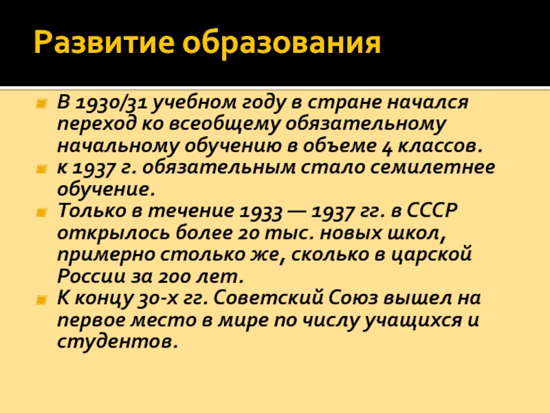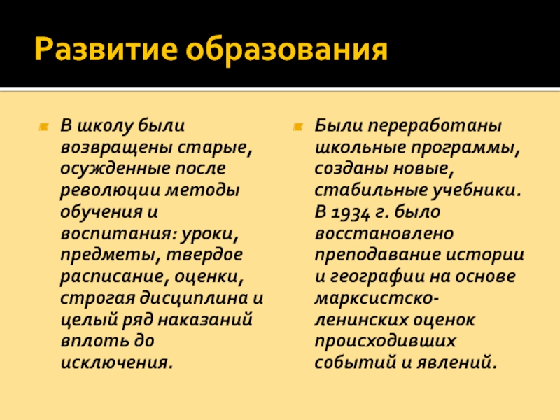 Были переработаны школьные программы, созданы новые, стабильные учебники. В 1934 г. было восстановлено преподавание истории и географии на основе марксистско-ленинских оценок происходивших событий и явлений.