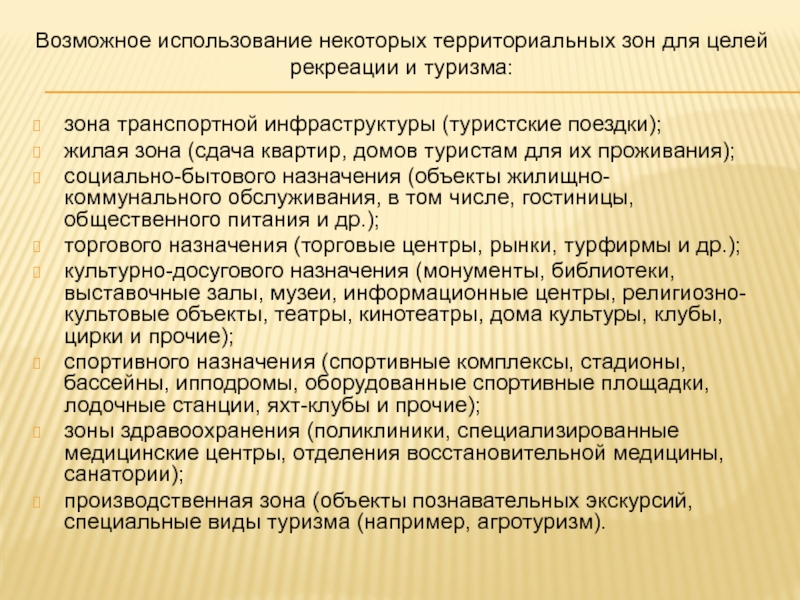 Слайд 6Возможное использование некоторых территориальных зон для целей рекреации и туризма: