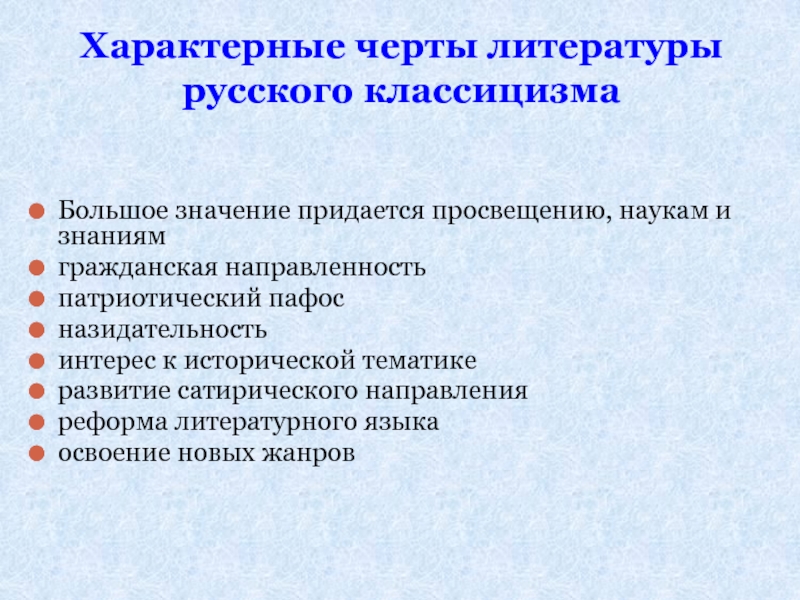 Патриотизм, неугасающий интерес к личности человека, связь с устным народным творчеством, осмеяние социальных и человеческих пороков