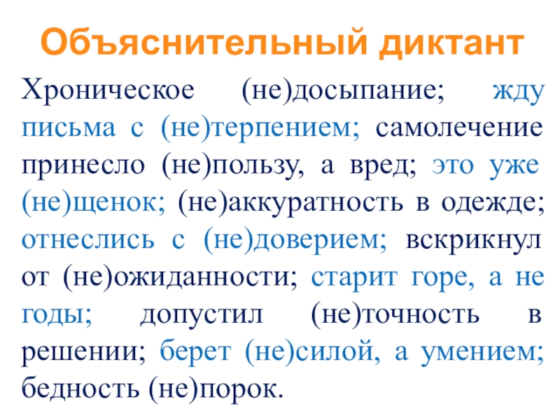 вскрикнул от (не)ожиданности; старит горе, а не годы; допустил (не)точность в решении; берет (не)силой, а умением; бедность (не)порок.Объяснительный диктант