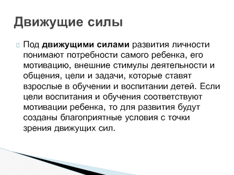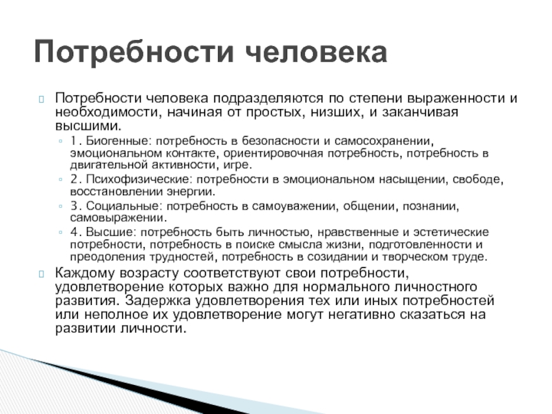Каждому возрасту соответствуют свои потребности, удовлетворение которых важно для нормального личностного развития. Задержка удовлетворения тех или иных потребностей или неполное их удовлетворение могут негативно сказаться на развитии личности.