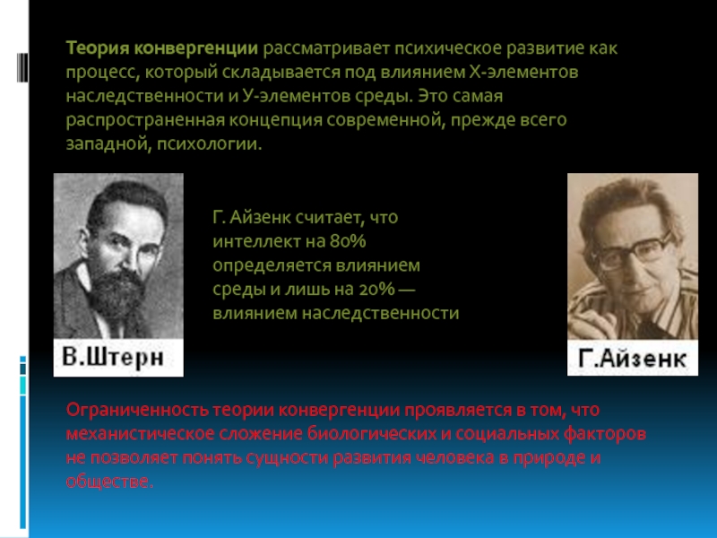Ограниченность теории конвергенции проявляется в том, что механистическое сложение биологических и социальных факторов не позволяет понять сущности развития человека в природе и обществе.