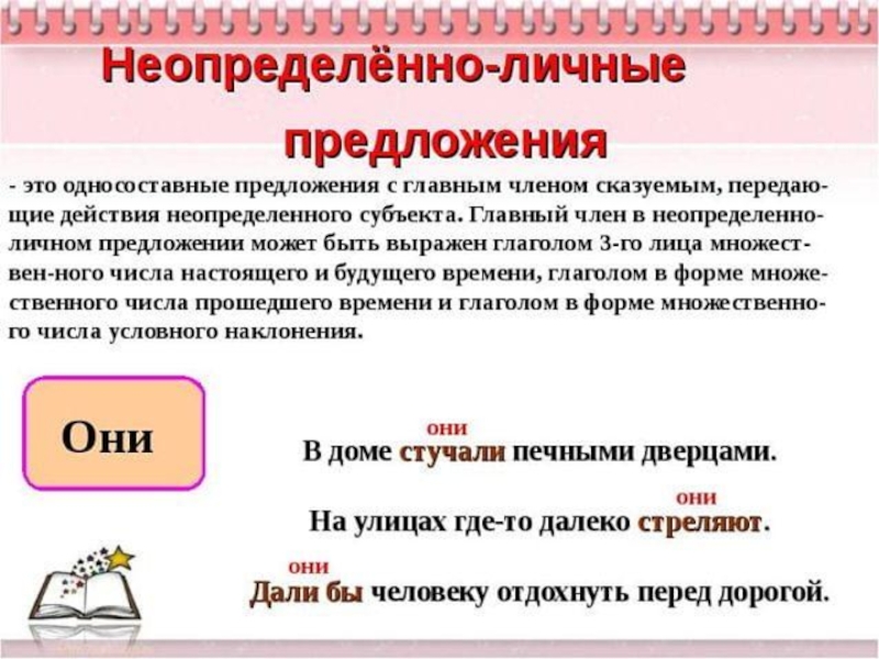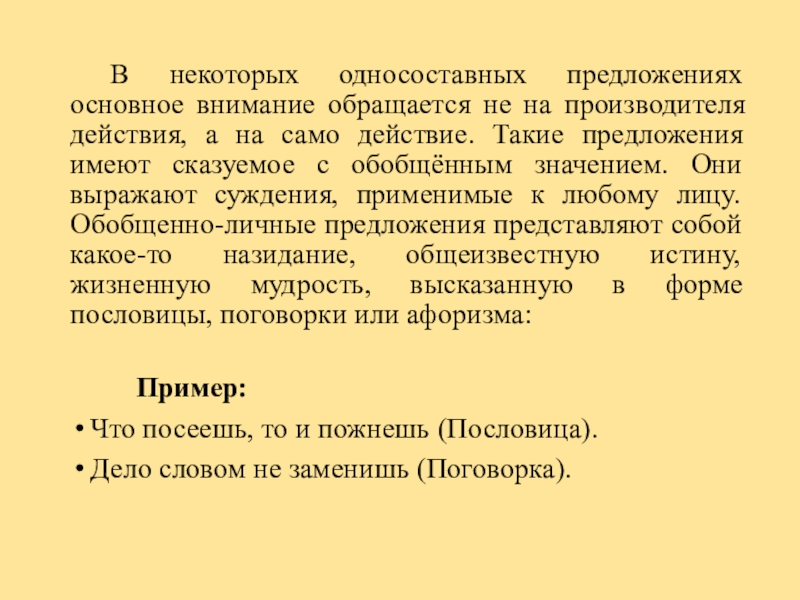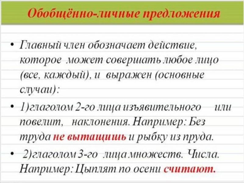 1. При первом рассвете выходим по одному в разные стороны в ельник за белками (Пришвин). 2. Собирают клюкву поздней осенью (Пришвин). 3. По такой лыжне без лыж полверсты не пройдёшь (Пришвин). 4. В Обломовке верили всему: и оборотням, и мертвецам (Гончаров). 5. В жаркую летнюю пору лошадей выгоняют у нас на ночь кормиться в поле (Тургенев). 6. Нигде не найдёшь в лесу жизни более обильной и страстной, как возле старого пня (Пришвин). 7. Другого сторожа на место Антипича не назначили (Пришвин). 8. Темнело быстро, по-осеннему (Паустовский). 9. В лесах было холодно (Паустовский). 10. Документов при нём не найдено (Лавренев). 11. В комнате свечи нет (Гоголь). 12. Снег и чайки (Симонов). 13. Под рокотанье вешних гроз не зеленеть побегам (Дудин). 14. Весь день мне пришлось идти по заросшим луговым дорогам (Паустовский). 15. Никогда не исчезнуть из моей памяти этому мрачному утру (Федосеев). 16. Кому не приходилось спать на бережку шумного ручейка! (Федосеев). 17. В мезонине уже натоплено (Паустовский). 18. Вообще там денег тратить не любили (Гончаров). 19. Только давай выйдем как можно пораньше! (Пришвин). 20. Дни поздней осени бранят обыкновенно (Пушкин).