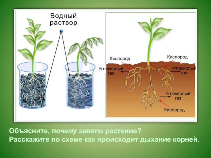 Объясните, почему завяло растение?Расскажите по схеме как происходит дыхание корней.