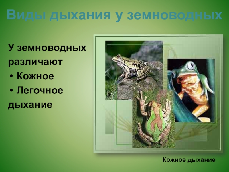 Виды дыхания у земноводныхУ земноводных различаютКожноеЛегочноедыхание   Кожное дыхание