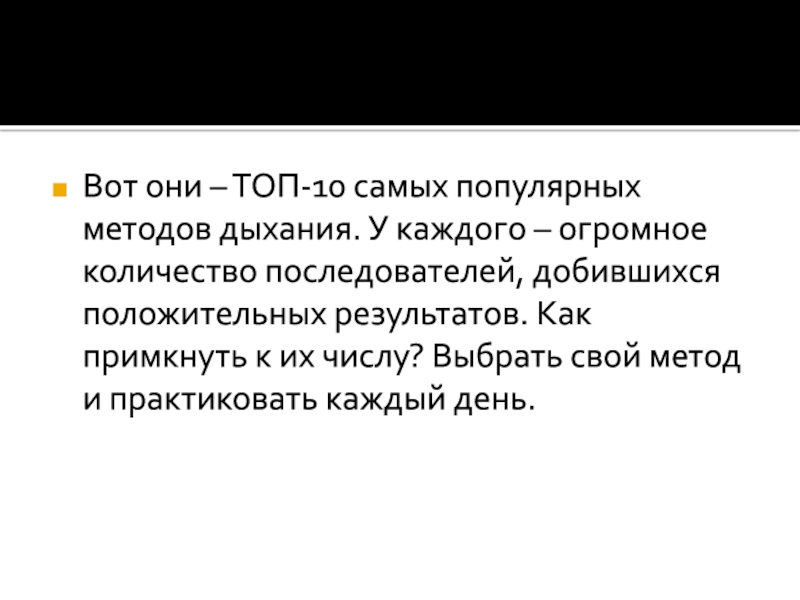 Слайд 13Вот они – ТОП-10 самых популярных методов дыхания. У каждого