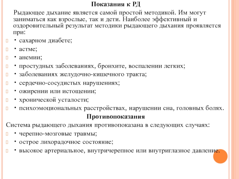 После прекращения РД занимающиеся переходят на обычное носовое дыхание. Такое чередование можно делать несколько раз в день. Показателем необходимости в РД является увеличение продолжительности вдоха более 2-3 секунд.