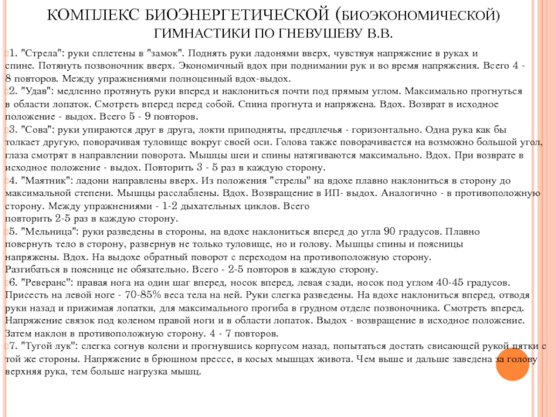 Слайд 10КОМПЛЕКС БИОЭНЕРГЕТИЧЕСКОЙ (БИОЭКОНОМИЧЕСКОЙ) ГИМНАСТИКИ ПО ГНЕВУШЕВУ В.В.
