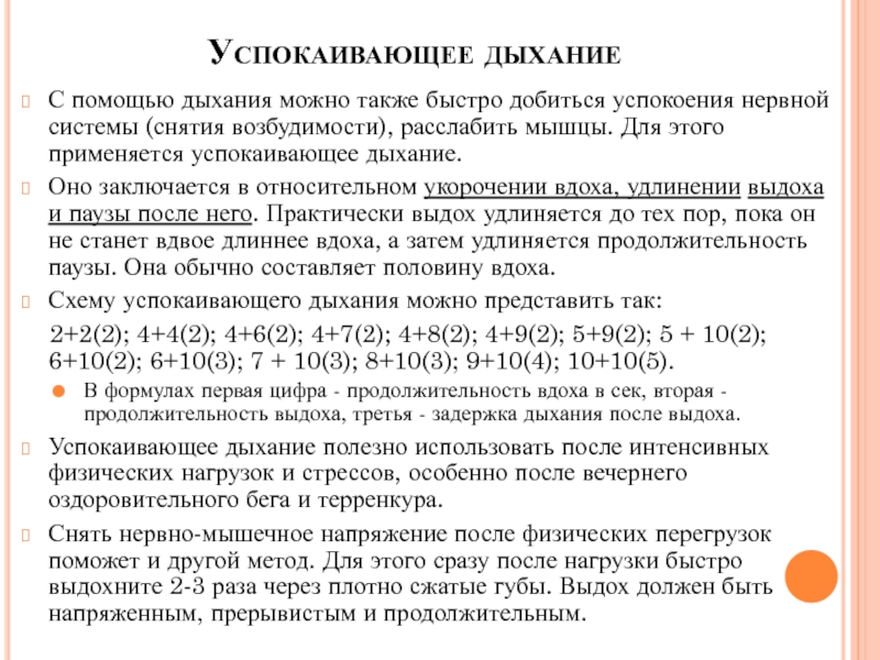 системы (снятия возбудимости), расслабить мышцы. Для этого применяется успокаивающее дыхание.
